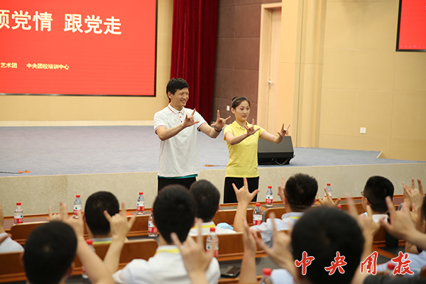 邰丽华为大家演示了“国家标准”手语版国歌,并与支部党员和学员进行互动,教授大家手语国歌。艺术团的专业演员教授大家《光荣啊,中国共青团》的手语,她们拆解并细心讲授每一个手势和动作的要领,台上台下气氛热烈而感人。最后,在激昂的音乐和饱满的情绪中,在场人员成功联合“歌唱”了手语版《光荣啊,中国共青团》。