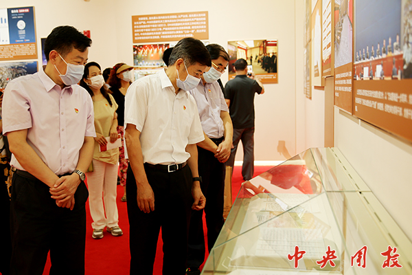 参观学习中,同志们不时驻足深思凝视,交流观感体会。在共青团中央展板前,当看到一张张展示着团中央在政治建设、理论学习、青少年工作等方面取得成绩的图片时,同志们深感自豪。党员干部还现场参与了党史知识答题。
