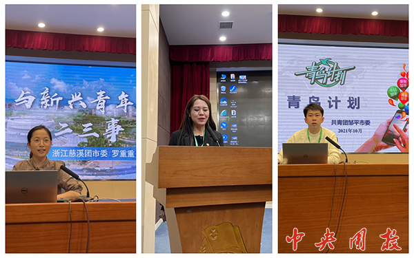 10月21日,在基层组织团干部进修班(第9期)培训班学员讲堂上,东莞理工学院团委书记劳丹介绍了学院青锋剑新媒体工作室的运营模式。重庆市公安局团委书记秦佳介绍了如何搭建新时代公安青年成长成才平台。中国石油大学(华东)团委组织部长刘秋蘅和江南大学团委副书记单云婷分别从学校共青团的角度介绍了各自在夯实思想引领方面的经验做法。