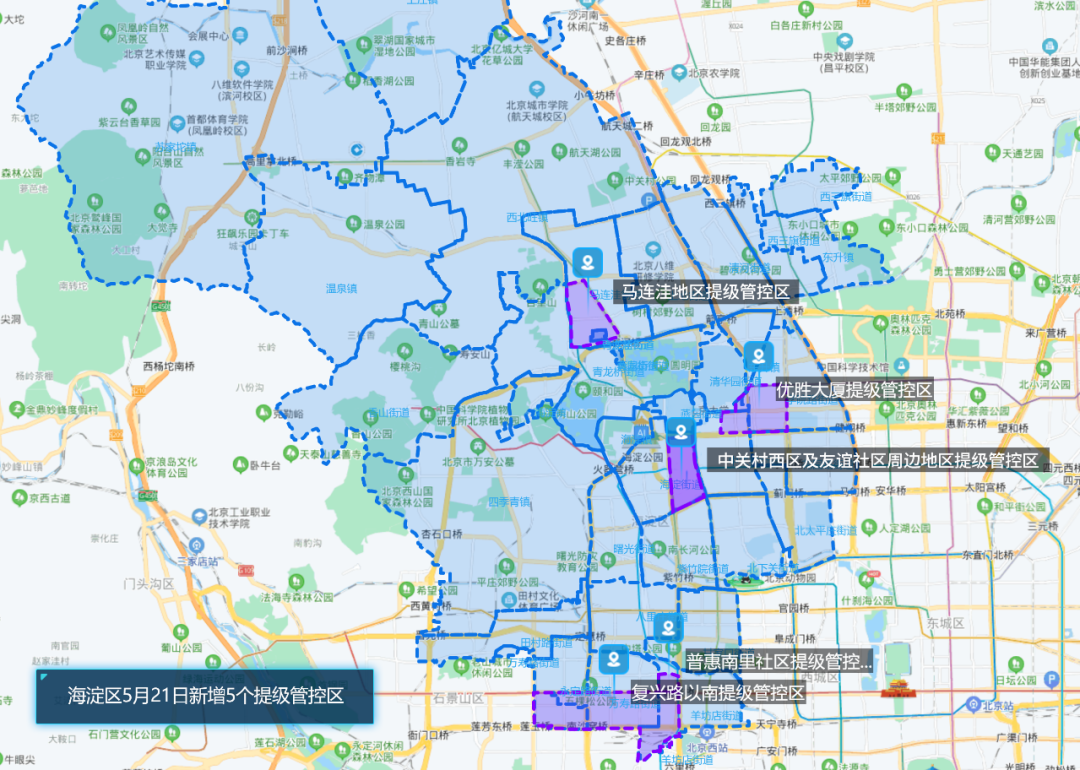 为遏制疫情扩散蔓延,保障群众健康安全,按照“非必要不流动”原则,经研判,自5月21日12时至5月28日12时(暂定),海淀区全域实行提级管控措施,现通告如下: