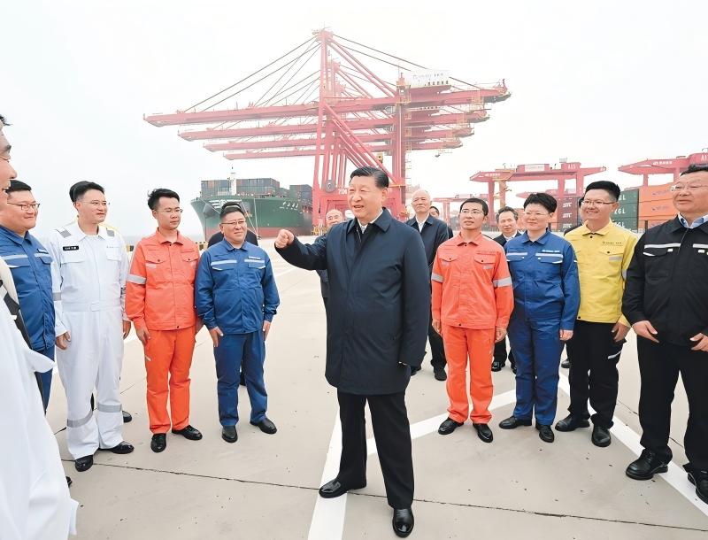 2024年5月22日至24日,中共中央总书记、国家主席、中央军委主席习近平在山东考察。这是22日下午,习近平在日照港亲切慰问港口科技工作者、运营人员、航运人员。 新华社记者 谢环驰/摄