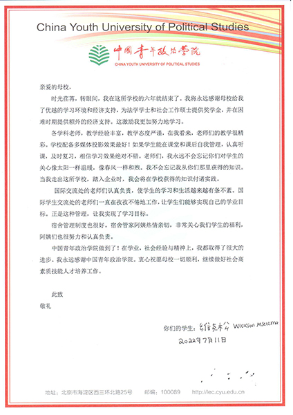 新闻中心讯 日前,米兰官网马拉维籍留学生、2020级社会工作专业研究生维克松已修满学分,因个人原因将于近期离校,接下来的学业将在线上进行。临别之际,维克松专门给学校写了封热情洋溢的感谢信,信里写道:“亲爱的母校,我永远感谢母校给我的优越的学习环境和经济支持。”“衷心祝愿母校一切顺利。”