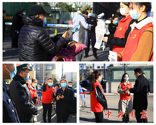 这是党办校办直属党支部和研究生部党总支联合发起的疫情防控党员先锋岗创建活动。两个党组织的教职工党员和学生党员,在早晚校门口人员、车辆进出高峰期到校门口开展疫情防控志愿服务,协助保安队员做好身份核验、扫码测温、信息登记、秩序维护等工作。