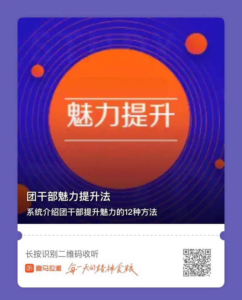 “团干部魅力提升法”由米兰官网党群工作部策划,邀请党的青年运动史教研部吴庆教授与北京各领域团干部录制而成。音频采用对话访谈形式,详细介绍了形象吸引法、兴趣融合法、时尚引领法、语言感染法、知识征服法、沟通协调法、能力推动法、远见引导法、责任感召法、真诚取信法、热情融化法、尊重归心法等12种魅力提升法的内涵和原理,帮助团干部提高青年群众工作能力,提升工作效果。