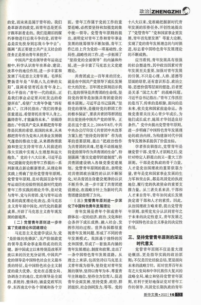 该文认为,中国共产党在百余年奋斗征程中,始终把青年工作作为党的一项极为重要的工作,在领导青年工作中积累了丰富的经验,“党管青年”是贯穿党的青年工作的政治灵魂和鲜明主线。“党管青年”有着丰富的政治内涵,可以从党缔造共青团、党领导共青团、党领导青年运动、党引领青年发展四个维度来理解把握。进入新时代,党的文件中首次明确提出“坚持党管青年原则”。这一原则的提出,进一步从根本上揭示了党与团、党与青年关系的本质内核,丰富和发展了马克思主义青年观,标志着党的青年工作理论更加成熟。坚持党管青年原则,是新时代共青团工作和青年工作沿着正确方向推进的根本保证,对于团结组织动员广大青年向着第二个百年奋斗目标、向着中华民族伟大复兴迈进具有重大意义。
