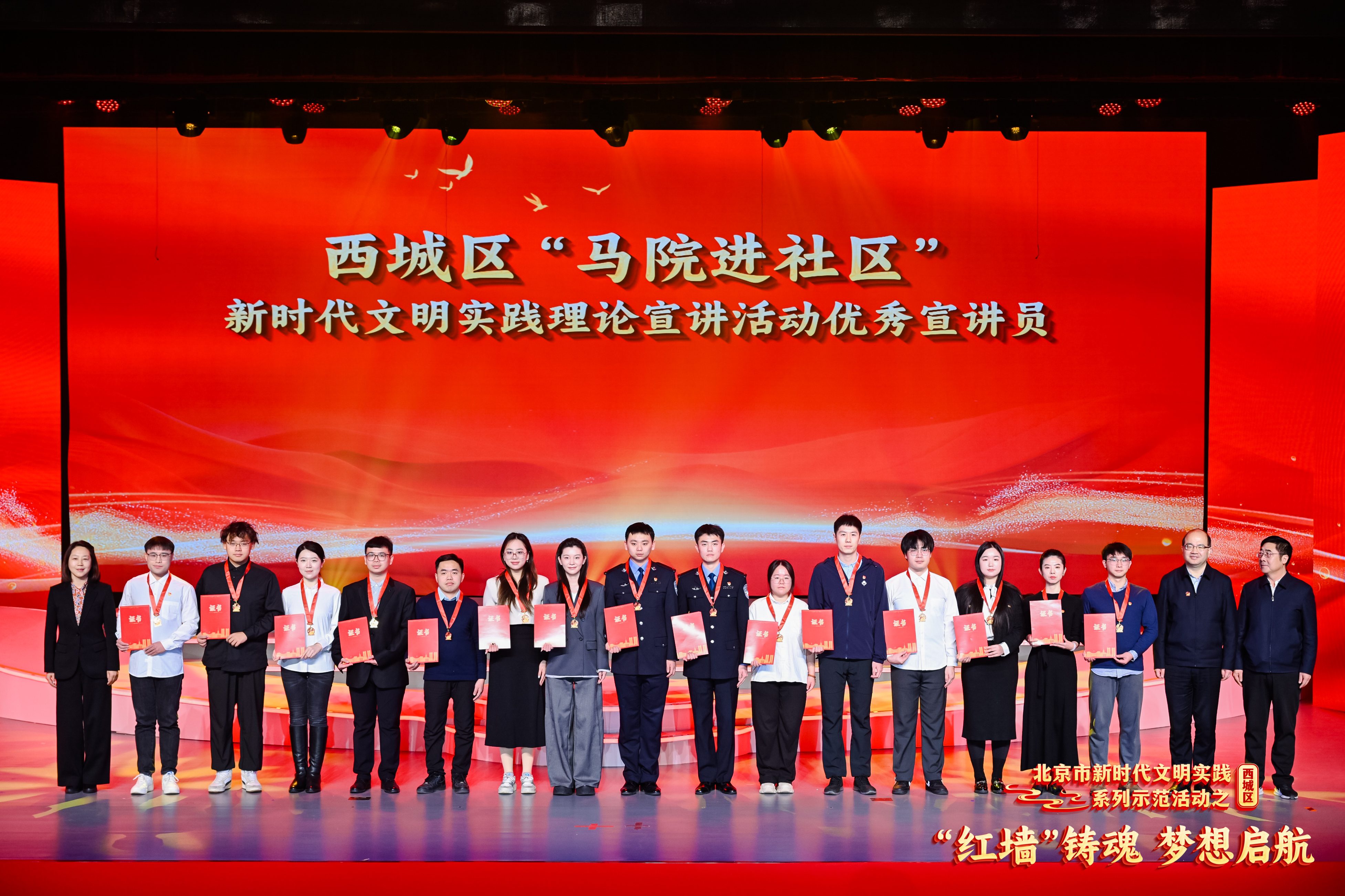 本场活动由中共北京市委宣传部、首都精神文明建设委员会办公室主办,中共北京市西城区委宣传部承办。我院与中国社会科学院大学、清华大学、中国人民大学、中国人民公安大学等首都高校相关领导与青年宣讲员代表共同受邀参加,获颁“优秀宣讲团体”纪念奖杯、志愿服务证书与“优秀宣讲员”纪念奖章。