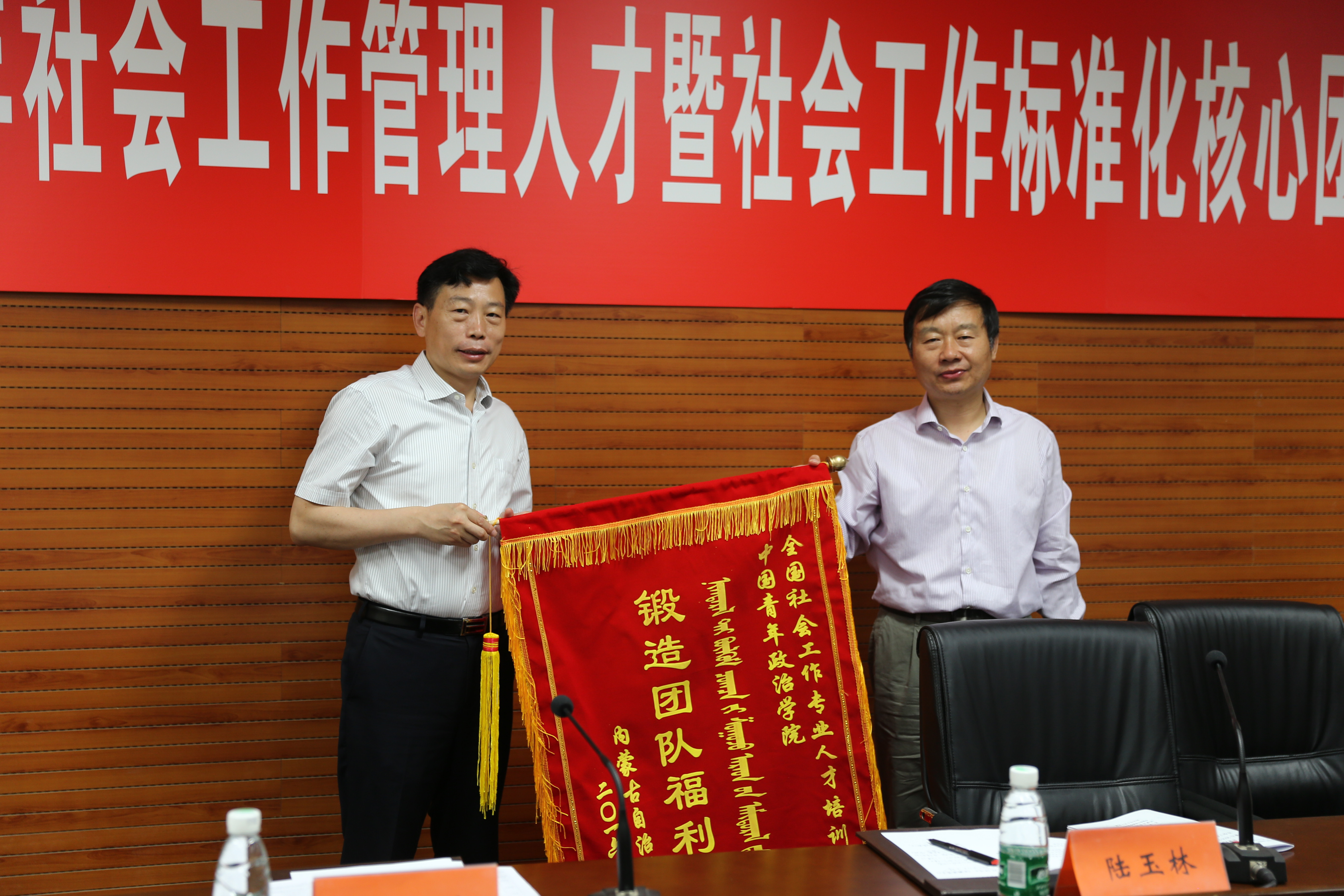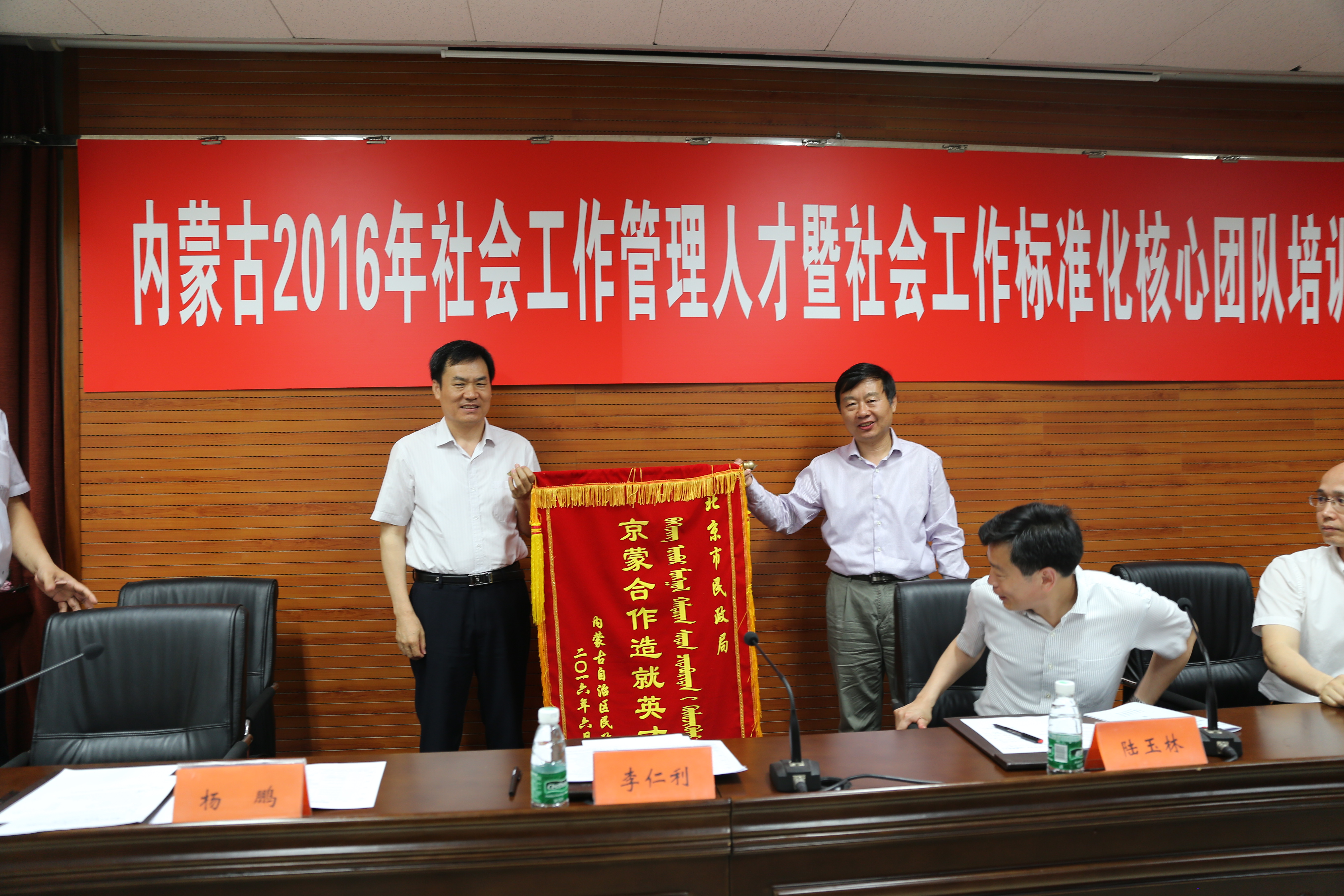 本期培训班是2016年京蒙区域人才合作项目,培训的主题是贯彻落实全国社区社会工作人才建设暨社会工作标准化建设的指导精神,加快内蒙古自治区社会工作人才建设及社会工作标准化推进步伐,为创新基层社会治理、完善社区服务体系、巩固党执政基础提供有力支撑。米兰官网党委常委、副校长陆玉林,北京市民政局社会工作处处长李仁利,内蒙古自治区民政厅社会工作处处长马青城出席开班仪式并讲话,民政部人事司科技与标准化处处长邹永宏出席开班仪式并为培训班做题为《民政标准化现状与政策》的首场讲座,开班仪式由继续教育学院院长杨鹏主持。在开班仪式上,内蒙民政厅向北京市民政局和中国青年政治学院分别赠送了锦旗。
