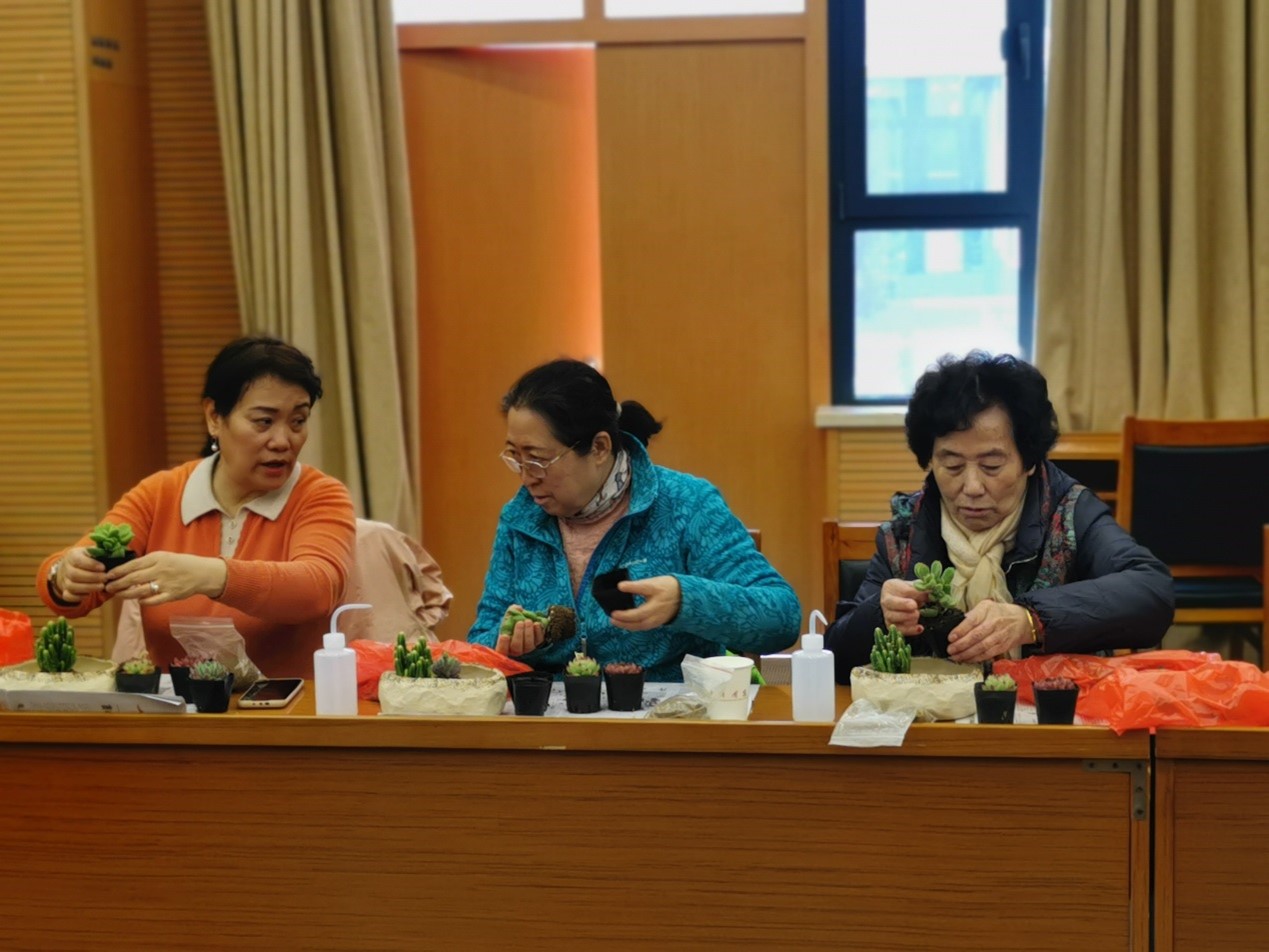 活动邀请具有丰富经验的花艺师授课,从生长环境、水分要求、日照时间等关键要素详细讲解多肉植物的生长习性和养护方法。活动现场气氛热烈而轻松,20多位喜欢多肉植物的女同志相互交流心得,大家认真研究老师总结的12字养护口诀,说到养花中常见的错误,一阵阵笑声此起彼伏。在老师的指导下,养花中的困惑和难点一一得到解答,随后大家跟随老师现场种植多肉盆栽。大家兴致盎然,纷纷动手栽种、培土、装饰……个个乐此不疲,亲手创作各具风格的盆栽作品。老同志纷纷表示这次活动很有意义,不仅感受到节日的祝福,又学到了实用的园艺知识,增长了知识,陶冶了情操,感到十分开心。